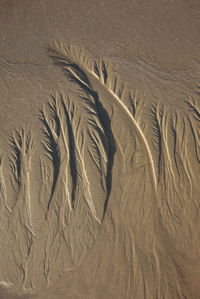 En se retirant, la mer grave soigneusement sur la grève de bien étranges motifs. Ce sont des arbres dont la ramure s’épanouit sur un ciel de sable aux teintes dégradées. Les racines, tendues vers l’océan, dessinent sur le sédiment gris et granuleux, un feston qu’on croirait copié d’une affiche Art nouveau.